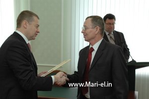 На торжественной церемонии Леонид Маркелов вручил премию Президента Республики Марий Эл «Золотое перо Марий Эл» за лучшую журналистскую работу 2009 года заместителю главного редактора газеты «Волжская правда» Александру Климову.