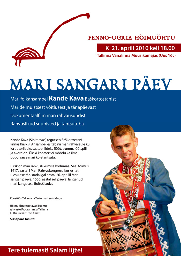 Празднование дня началось сегодня в 18.00 в Доме музыки Старого города Таллинна. На вечере расскажут об истории и настоящем марийского народа, покажут фильм о традиционной религии мари, выступит фольклорно-эстрадный ансамбль из Башкортостана «Канде кава». Позже пройдет мастер-класс по марийским и эстонским танцам.