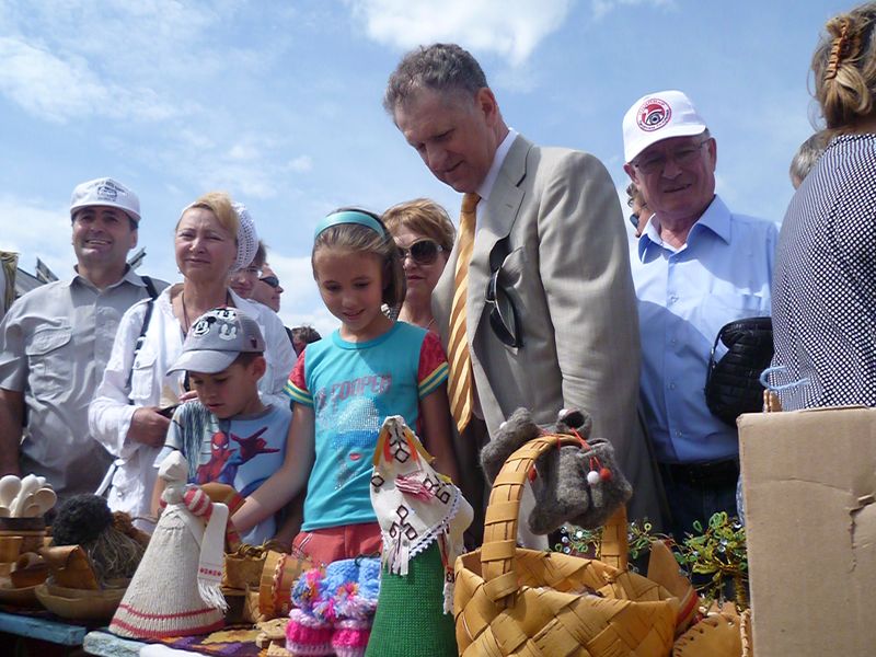 После открытия «Гербера» члены республиканского кабинета министров во главе с Александром Волковым направились к «Городу мастеров». Вместе с супругой Галиной Волковой и внуками Президент обошел все подворья, приобрел поделки для домашнего хозяйства и пообщался с гостями.