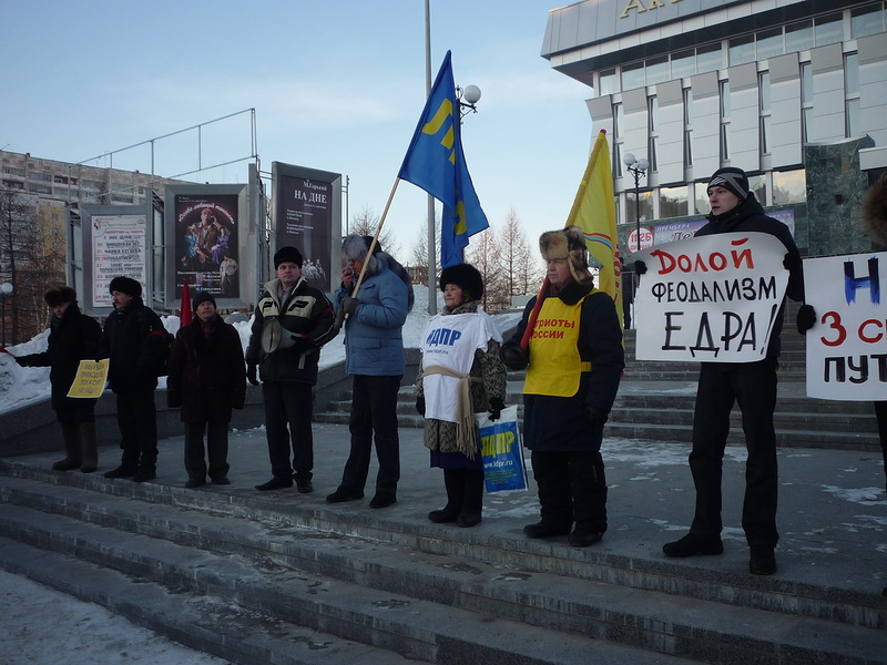 На ступеньках драмтеатра посредством мегафона выступающие вспоминали прошедшие декабрьские выборы, говорили о предстоящих мартовских. Сначала слово взяла, так называемая, несистемная оппозиция, затем представители парламентских партий (ЛДПР и КПРФ) и просто желающие высказаться. Так, «жириновцы» четко обозначили свою антипутинскую позицию, а коммунисты просто агитировали голосовать за Зюганова.