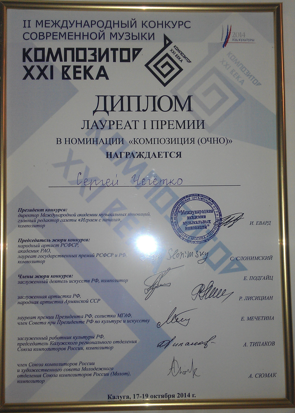 Первую премию в номинации «Композиция» завоевал композитор Сергей Чечётко, этнический мари, получивший первое музыкальное образование в Йошкар-Олинском музыкальном училище имени Йывана Палантая, а затем – в Казанской консерватории и Академии музыки им. Гнесиных.