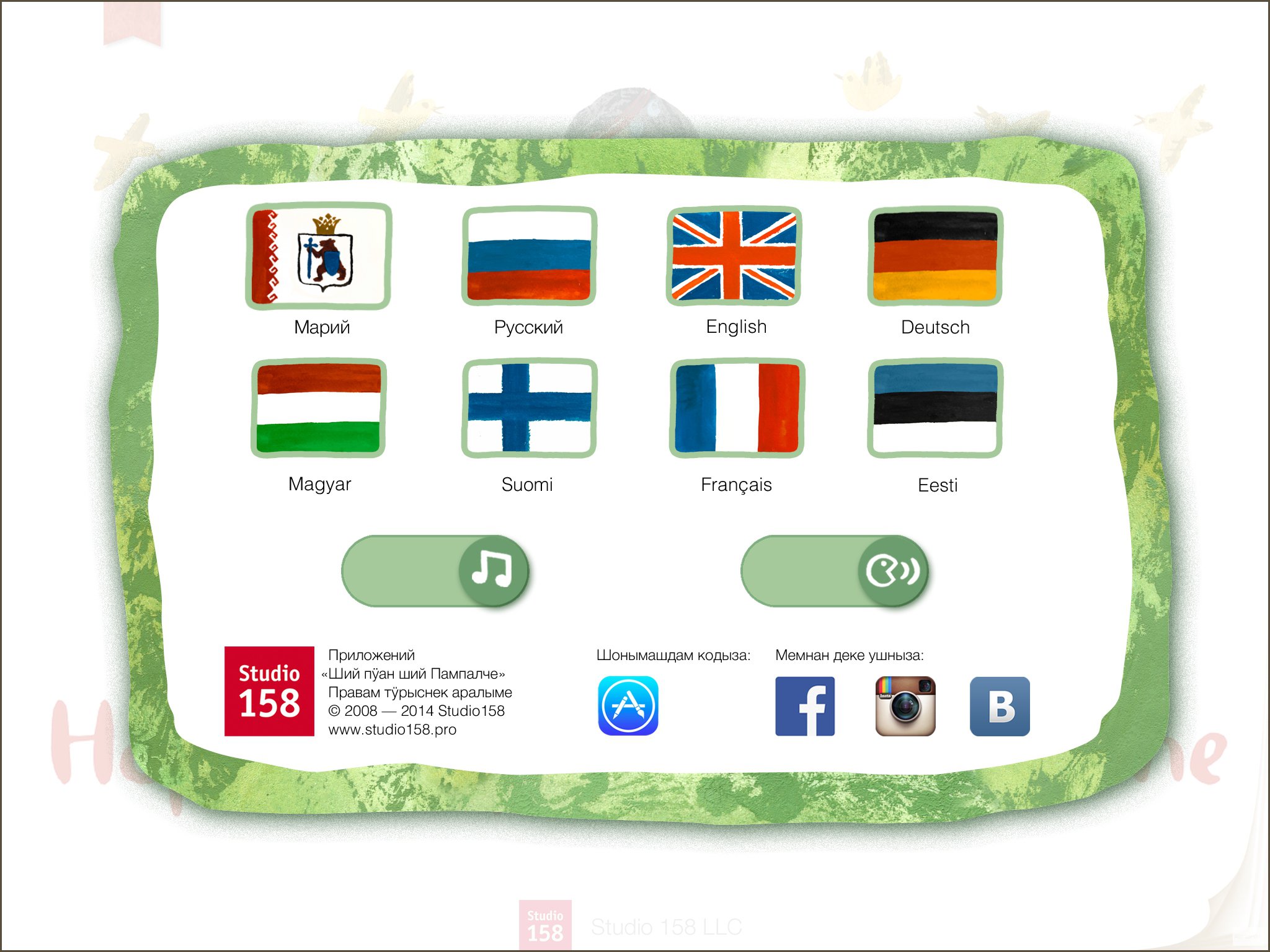 Приложение наполнено интерактивной анимацией, которая оживает от прикосновения. Звуковое оформление на марийском языке, оригинальная, специально написанная для приложения этническая музыка дает возможность полного погружения в атмосферу народной сказки самобытного народа мари. Книга переведена на 8 языков, включая финно-угорские: финский, эстонский, венгерский языки.