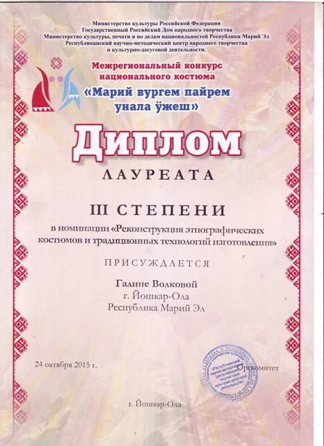 Лауреатом III степени в номинации «Реконструкция этнографических костюмов и традиционных технологий изготовления» стала член РОО «Марий ушем» Волкова Галина Николаевна, представившая в коллекции этнографической одежды «Шондыкысо акрет поянлык» три костюма марийского народа: повседневный, праздничный и обрядовый.