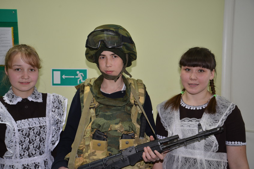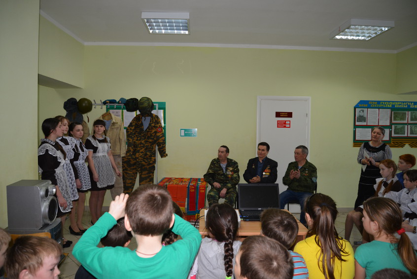 Прозвучала песня «Защитники Отечества» в исполнении квартета: Алина Тимкова, Кристина Япарова, Ольга Никитина, Лилия Алексеева. Учащиеся школы прочитали стихи, посвященные защитникам Отечества, участникам Афганской войны.