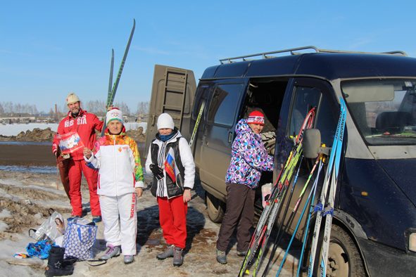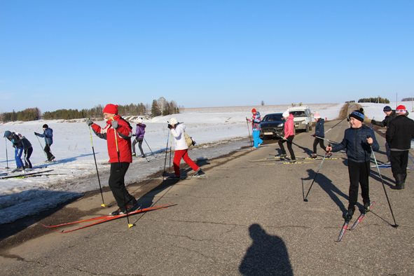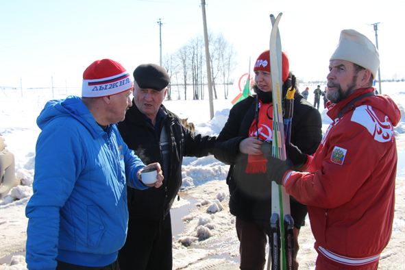 После одиннадцати часов на перекрестке дорог Мари-Турек – Олоры уже начал собираться народ. А старт еще только через полутора часа. К нашему подъезду там уже стояло несколько машин, среди которых выделялась «Тойота» с большим прицепом. Это явствовало, что организаторы заранее все предусмотрели и подстраховались: если надо, то проложить лыжню на снегоходе. Мы с ним познакомились – Григорий Петров, представился он. – Фермер». Коротко и ясно. Как все труженики села немногословен. Водитель снегохода открыл задние борта, заскочил на кузов и оттуда характерным рёвом съехал снегоход, словно лайнер, готовый на длительное плавание. Водитель ловко разрулил в сторону поля, прокатился, поблёскивая металлом между искрящим снегом и улыбающимся солнцем. После снегохода почти не оставалось следов – понятно, что наст крепкий, и возможно, он сегодня даже не понадобится.