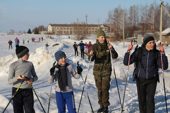 Далее дорога пролегала через деревню Усола. Там надолго не останавливались. К ним примкнули и лыжники Усолинской школы. До Параньги оставалось еще несколько километров. Мы не видели усталости у лыжников. Издалека они были похожи на маленьких корабликов, плавающих в огромном снежном пространстве.