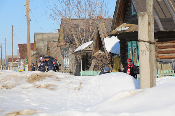 И вот в центре Олор появились первые лыжники, они то поднимались на высокие сугробы, то снова скрывались. На асфальте снег уже растаял, поэтому за несколько десятком метров от встречающих им приходилось снимать лыжи и бежать с приподнятыми лыжами.