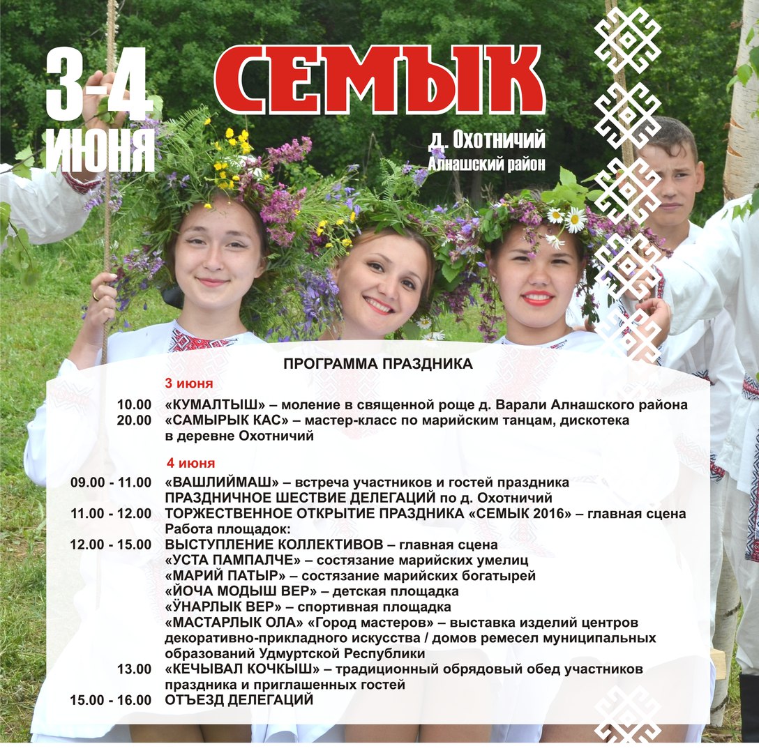 3-4 июня в деревне Охотничий Алнашского района состоялся республиканский марийский праздник Семык. На него съехались делегации со всей Удмуртии, а также из соседних регионов: Татарстана, Башкортостана, Кировской области — и из Марий Эл.