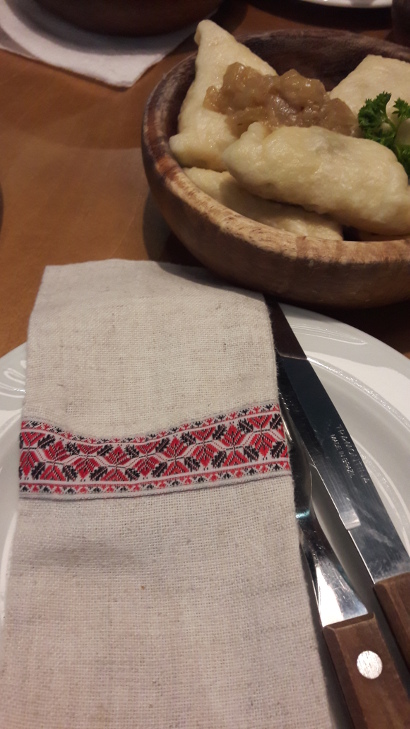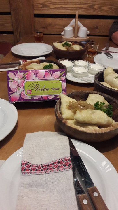 К вареникам подавали крепкую модную украинскую настойку «Дичка»на основе сушеной груши. Настоек на основе различных фруктов ресторан предлагает до 20 видов.
