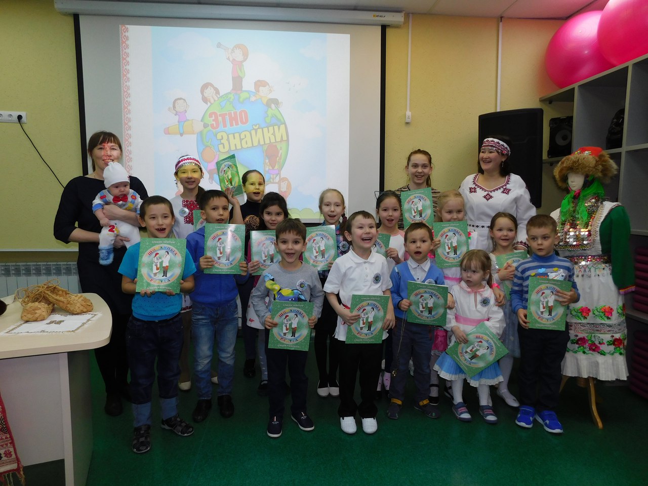 Одним словом, день прошел на «ура», это была не только познавательно-развлекательная встреча, но и встреча-праздник! Глаза наших деток сияли, они улыбались, играли, делились впечатлениями. А в конце мероприятия им были вручены индивидуальные подарки: цветные значки с названием проекта «ЭтноЗнайки» и оригинальный выпуск книг — раскраски с марийскими костюмами.
