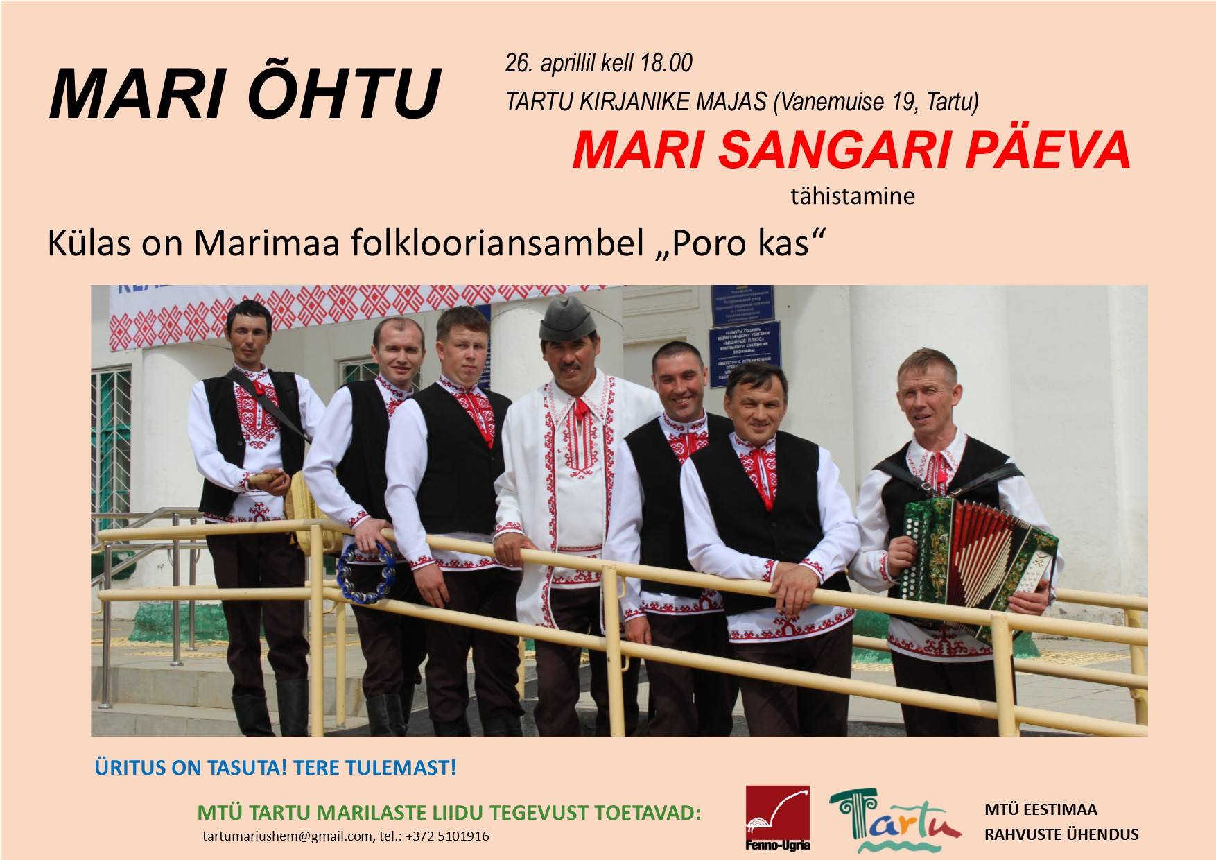 Завтра, 25 апреля, в столице Эстонии, Вечер родственных народов «Фенно-Угрии» будет посвящен Дню марийского героя. Мероприятие начнется в 19 часов в Доме музыки Старого города. На вечере выступит ансамбль «Поро кас» из Параньгинского района Марий Эл.