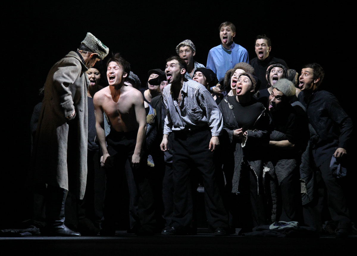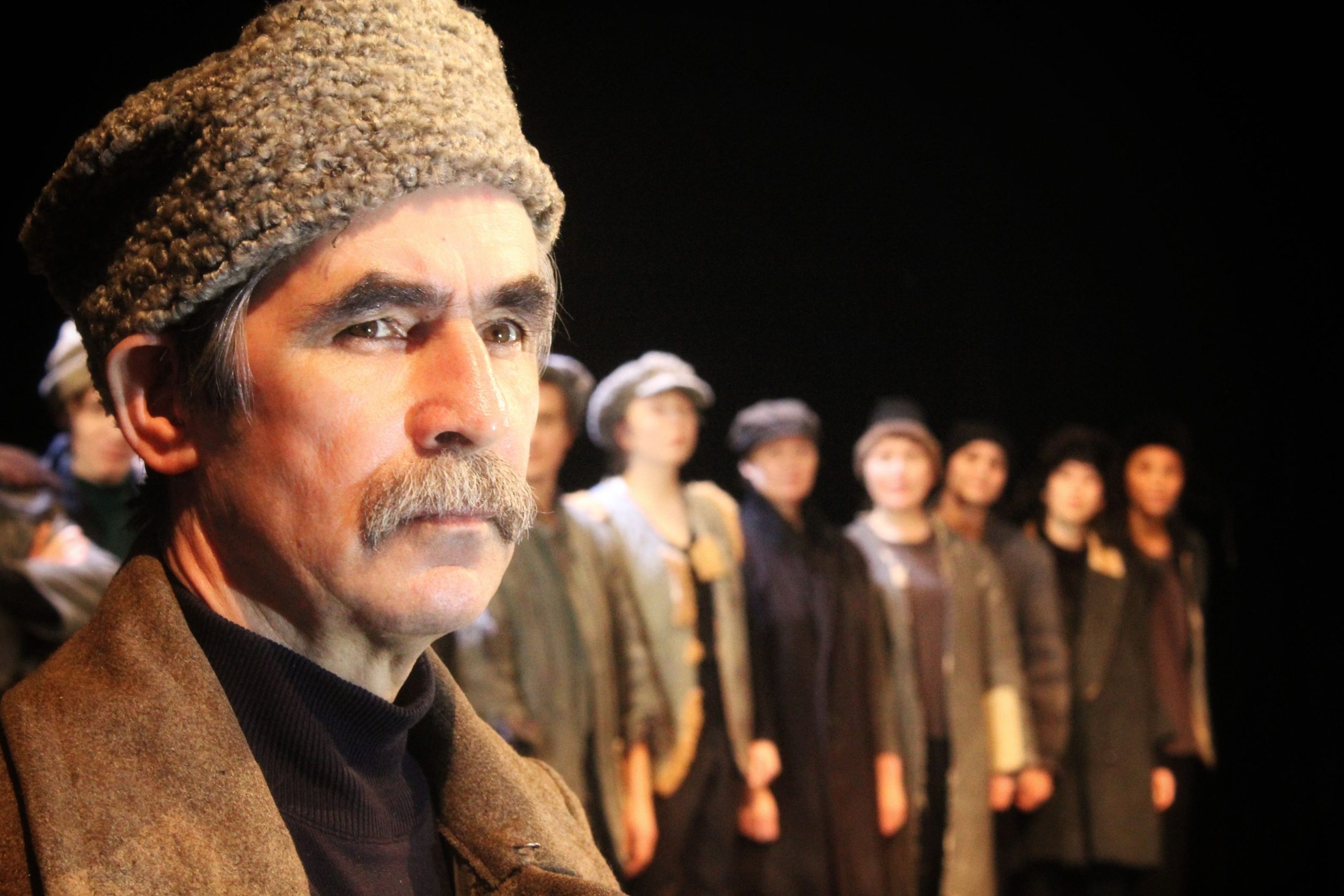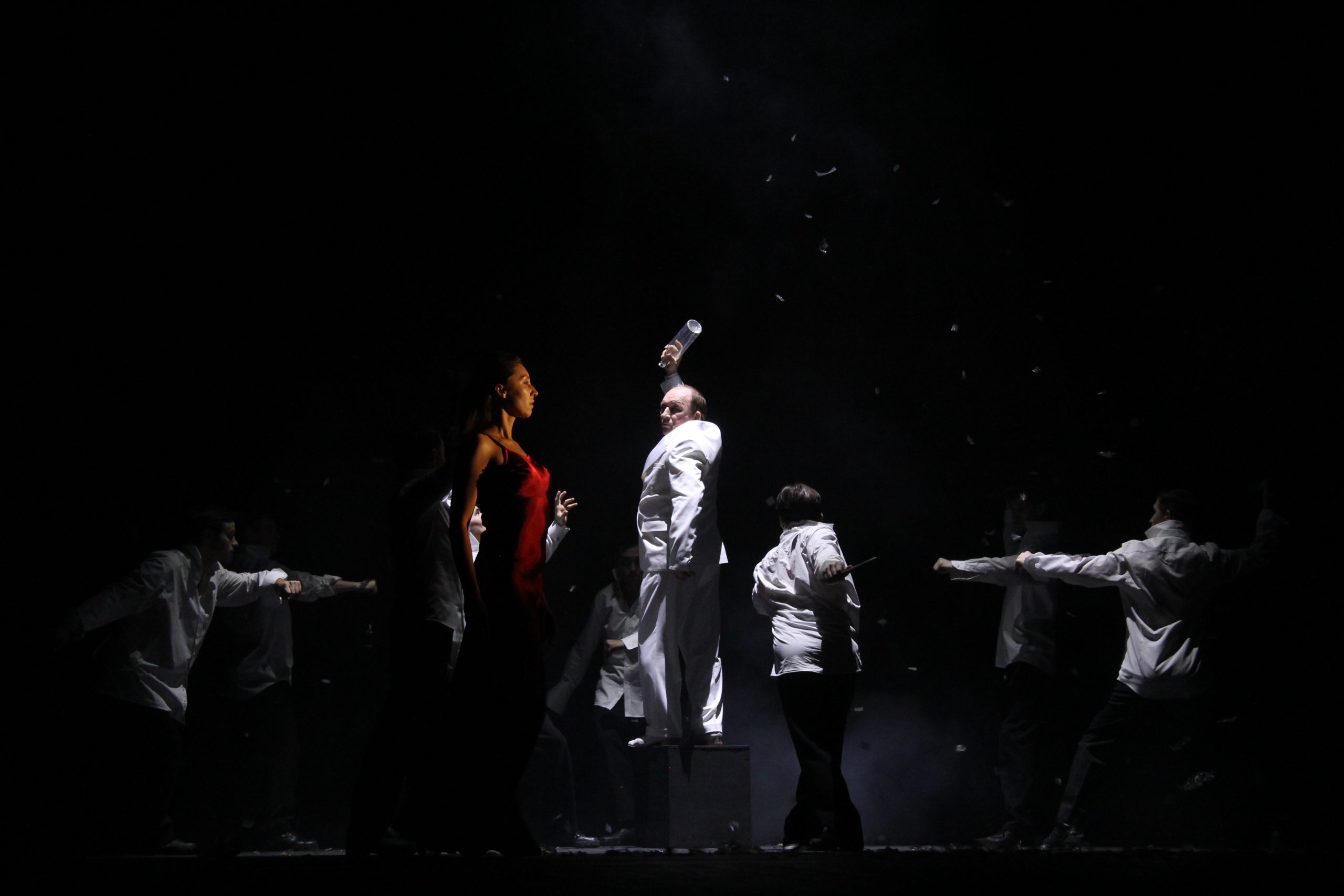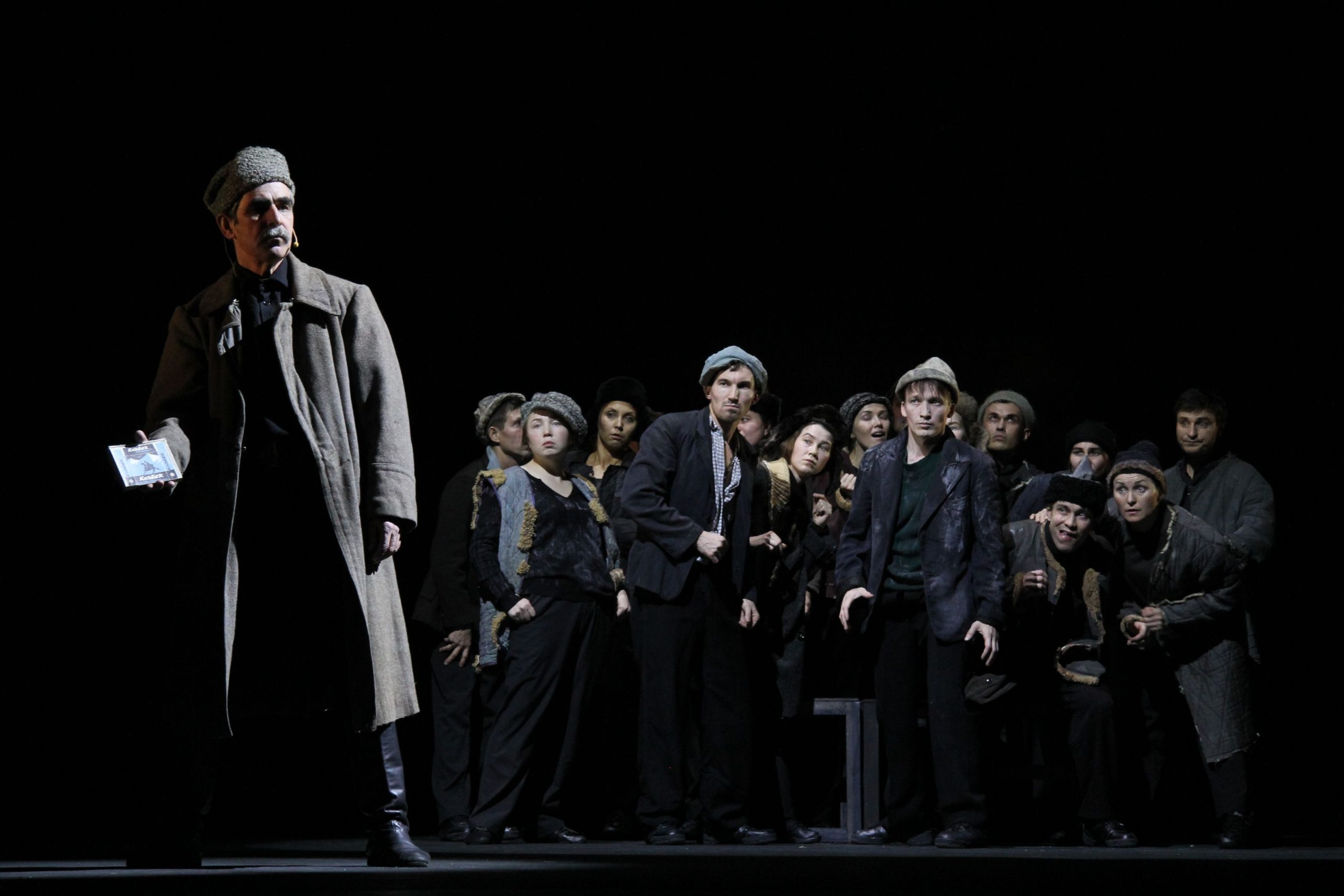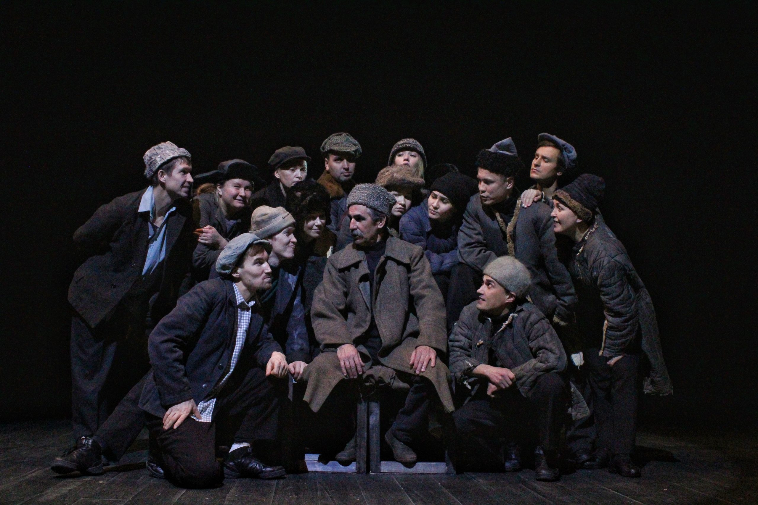 Внутри спектакля тлеет, бьется слепая юная вера в новую жизнь. Вспыхивают в темноте небытия крепкие сбитые образы той эпохи. Человек-масса, юный физкультурник, комсомолец, беспризорник, люди, сошедшие с барельефов дворцов рабочих и крестьян. Время, вдохновленное Маяковским, небо в упругих транспарантах, стройный шаг, звонкий хор.