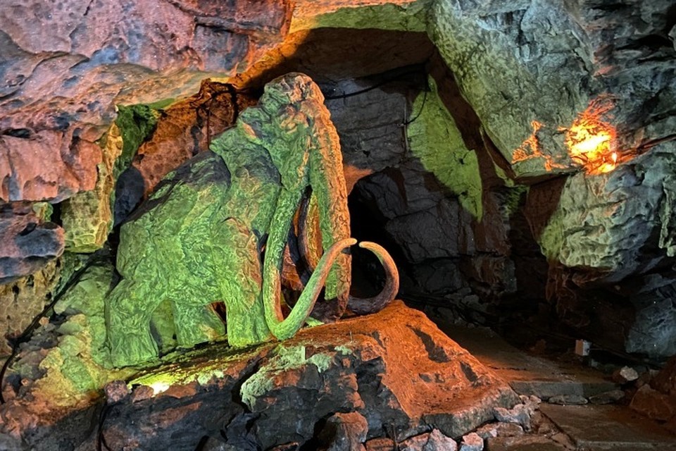 Появился двухметровый мамонт в ледяной пещере Кунгура недавно. Его установили в переходе между гротами Крестовый и Данте.