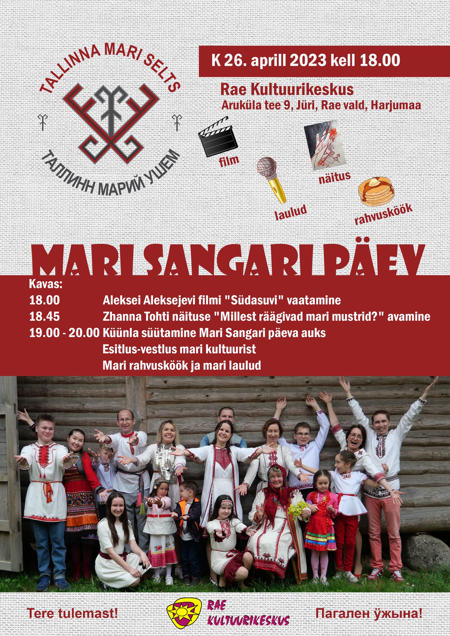 Мы уже публиковали, что Марийский научно-исследовательский институт языка, литературы и истории имени В. Васильева организует 26 апреля круглый стол «Этногенез марийского народа». А также сообщали, что в Эстонии некоммерческое объединение «Таллиннское марийское общество» 26 апреля в деревне Раэ под Таллинном проведёт мероприятие, посвящённое Дню героя.