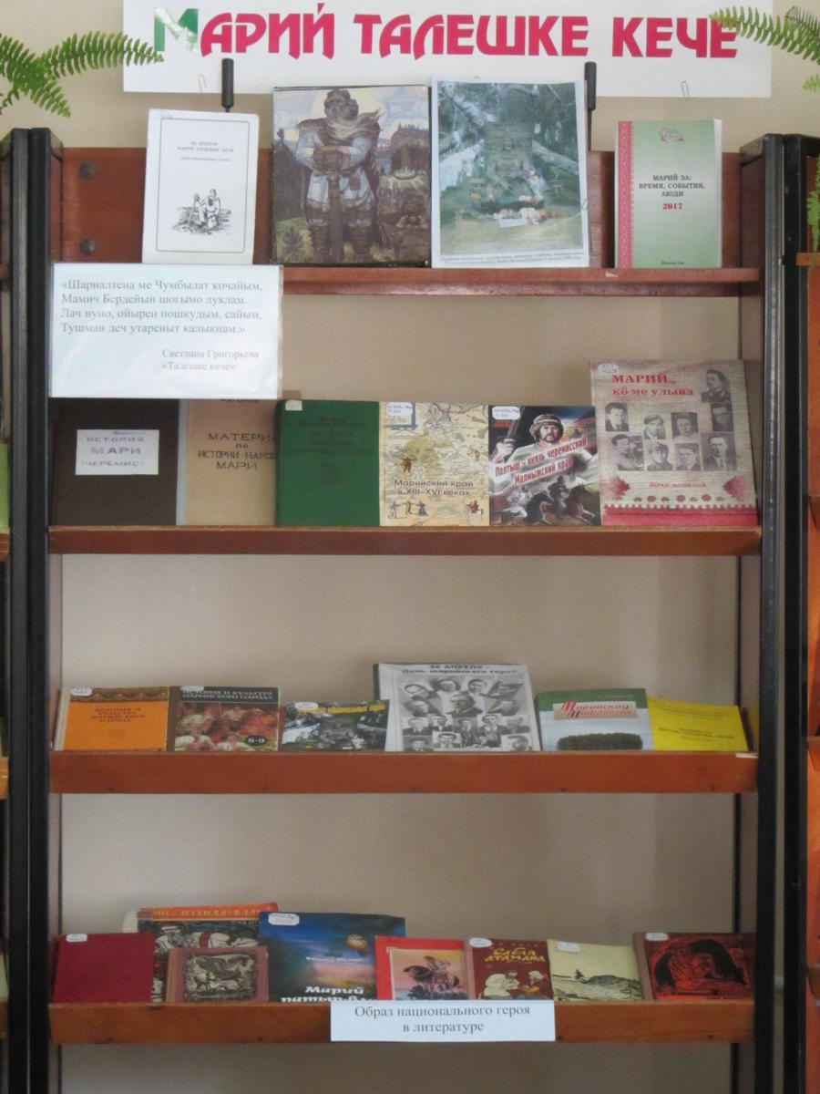 Ко Дню национального героя в отделе национальной краеведческой литературы и библиографии Национальной библиотеки Марий Эл имени С. Чавайна оформлена выставка «Марий талешке кече», пишет сайт организации.