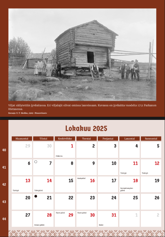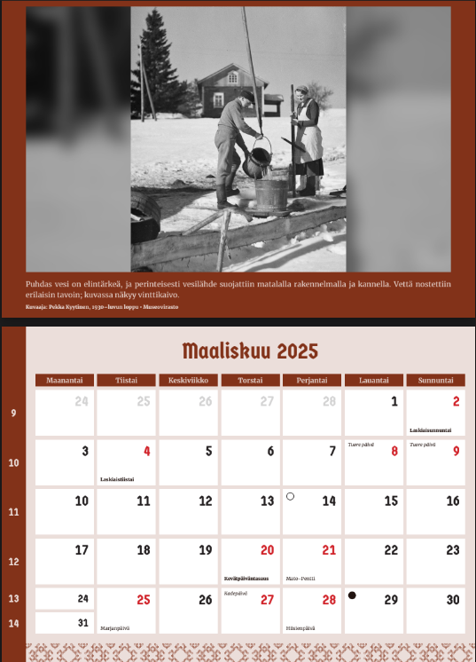 В этом году календарь украшают фотографии различных традиционных построек, найденных в деревнях по всей Финляндии. В подборку вошли разнообразные сооружения, которые часто встречаются на территории финской усадьбы. Особое внимание уделено зимним снимкам, на которых запечатлены интерьеры этих построек.