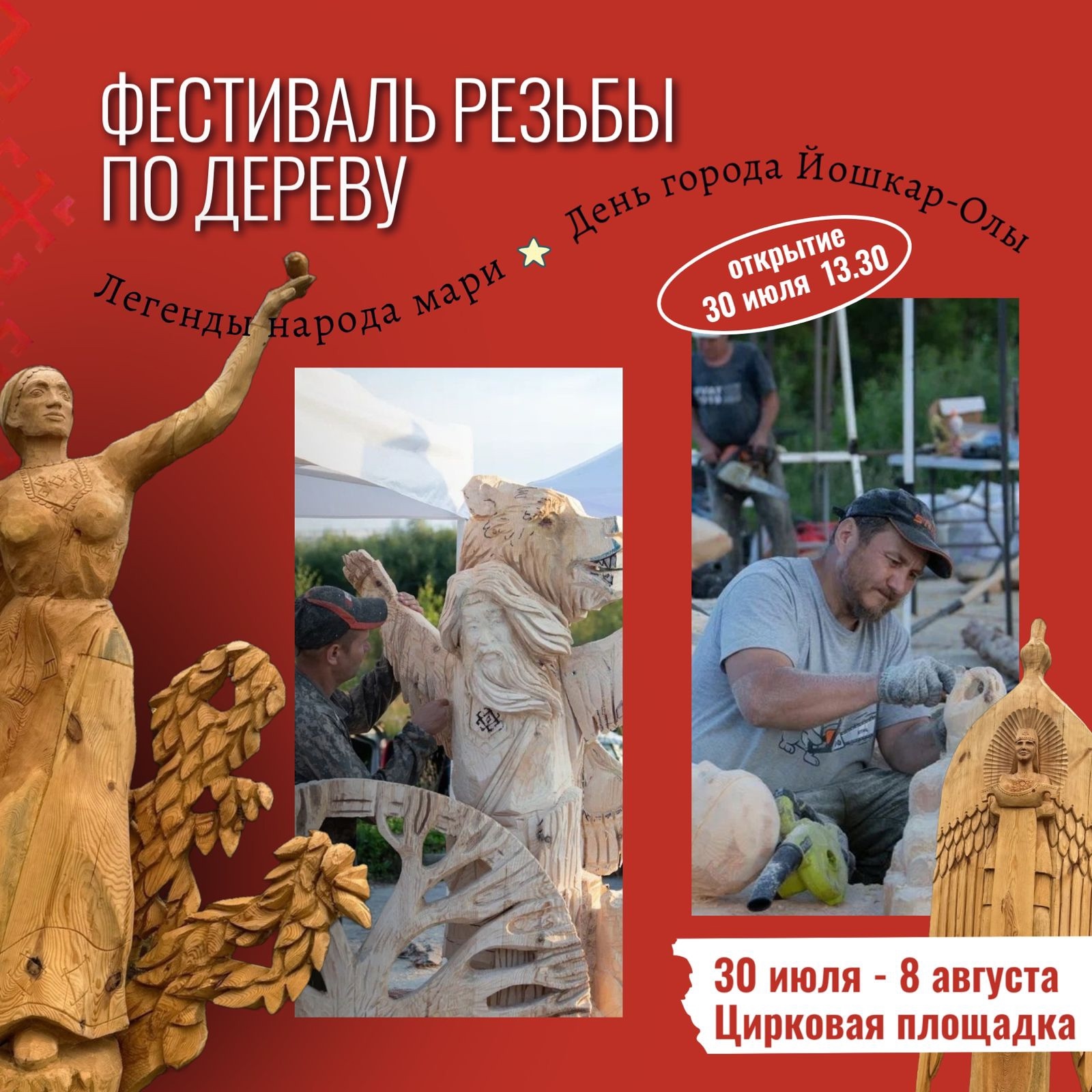 В Йошкар-Оле продолжается II Всероссийский фестиваль-конкурс деревянной скульптуры «Легенды народа мари». Мероприятие, которое стартовало 30 июля, проходит на Цирковой площадке и завершится 8 августа.