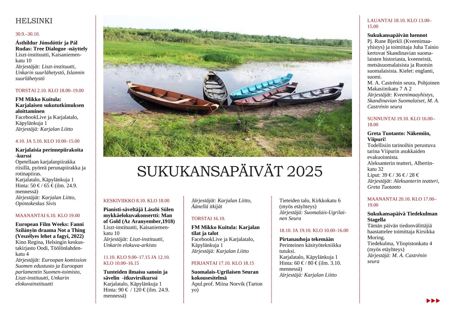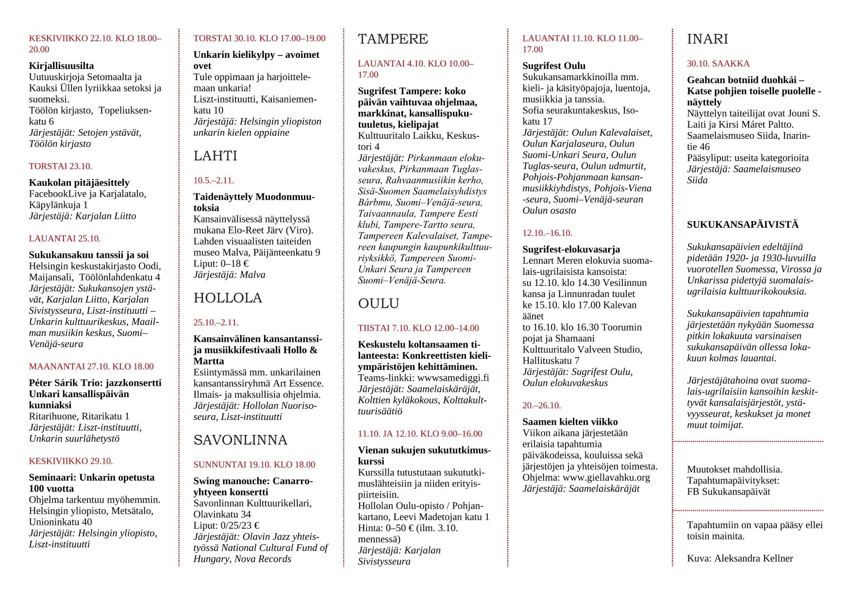 Дни родственных народов в этом году пройдут в Суоми с 30 сентября по 30 октября. В рамках фестиваля по всей стране состоятся десятки культурных мероприятий: от выставок и кинопоказов до концертов и мастер-классов. Мы подготовили перевод полной программы мероприятий, которая была опубликована в Facebook на странице Sukukansapäivät, чтобы вы могли ознакомиться с расписанием в каждом городе.